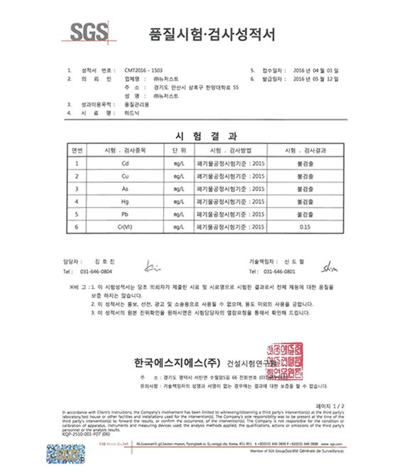 HARDNIC 성분 유해물 용출 평가 시험 성적서