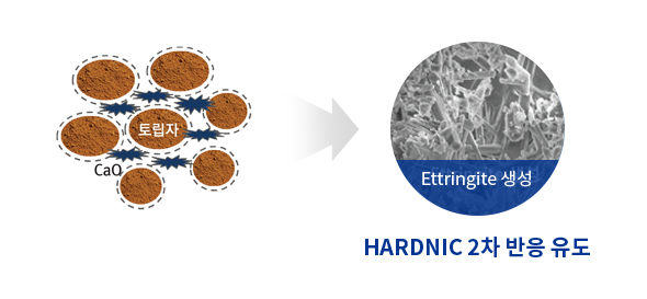 토립자를 둘러싸고 있는 포틀랜트시멘트는 물과 수화반응을 통해 ettringite (3CaO, Al2O3, 3CaSO4, 32H2O)형성, HARDNIC 기능성 첨가물이 수화 생성물 ettringite와 2차 반응을 하여 고강도 발현.